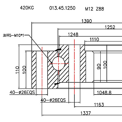 您現(xiàn)在的位置:首頁 > 產品展示 > 軸承 挖機底座轉盤軸承1-3米回轉支承洛陽廠家直供 起訂量:1件 在線訂購 內徑:500mm外徑:700mm厚度:60mm可加工內徑范圍:≤3000mm可加工外徑范圍:≤3500mm保持架及其材料:Y銅板沖壓滾動體類型:球滾動體列數(shù):單列/雙列/多列滾道類型:球面滾道密封防塵形式:密封條防塵精度等級:P4/P5/P0軸承材質:優(yōu)質碳鋼/合金鋼500mm-3500m'm轉盤軸承|大型回轉支承軸承|工程機械臂回轉支承軸承|吊車用轉盤軸承|小型轉盤軸承|小型回轉支承|內齒外齒回轉支承轉盤軸承 1 線為靜態(tài)承載能力曲線2 線為動態(tài)承載能力曲線8.8、10.9、12.9為螺栓承載曲線垂直方向M(104N.M)為傾覆力矩水平方向Fa(104N)為軸向力回轉支承選擇:實際使用承載力點 必須在承載能力曲線以下方可使用. 各種回轉支承在正常情況下的極限速度如下: 回轉支承類型 潤滑類型 極限速度(n.Dm) 交叉滾柱式 標準潤滑脂 24000-35000 滾球式 標準潤滑脂 40000-65000 滾球帶保持架 潤滑脂或油 70000-130000 其中n為極限轉速Dm為滾道中心直徑 單位(轉/分) 回轉支承材料對應牌號:50Mn對應的外國牌號為 國標產品50Mn美標產品1050,1053日標產品S53C英國標準080A52,080M50法國標準XC48蘇聯(lián)標準50Г 42CrMo對應國外牌號為國際標準組織號:42CrMo4對應日本牌號:SCM440對應德國牌號:42CrMo4或1.7225美國牌號:4140或G41400